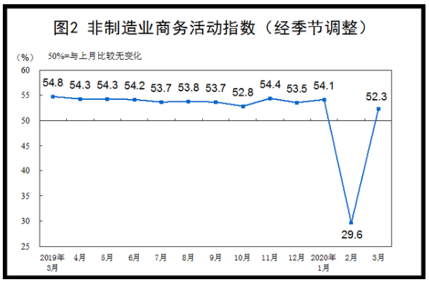 國家統(tǒng)計(jì)局服務(wù)業(yè)調(diào)查中心高級統(tǒng)計(jì)師趙慶河解讀稱,2020年3月份,我國統(tǒng)籌推進(jìn)新冠肺炎疫情防控和經(jīng)濟(jì)社會發(fā)展工作取得積極成效,疫情防控形勢持續(xù)向好,生產(chǎn)生活秩序穩(wěn)步恢復(fù),企業(yè)復(fù)工復(fù)產(chǎn)明顯加快。中國采購經(jīng)理指數(shù)在上月大幅下降基數(shù)上環(huán)比回升。