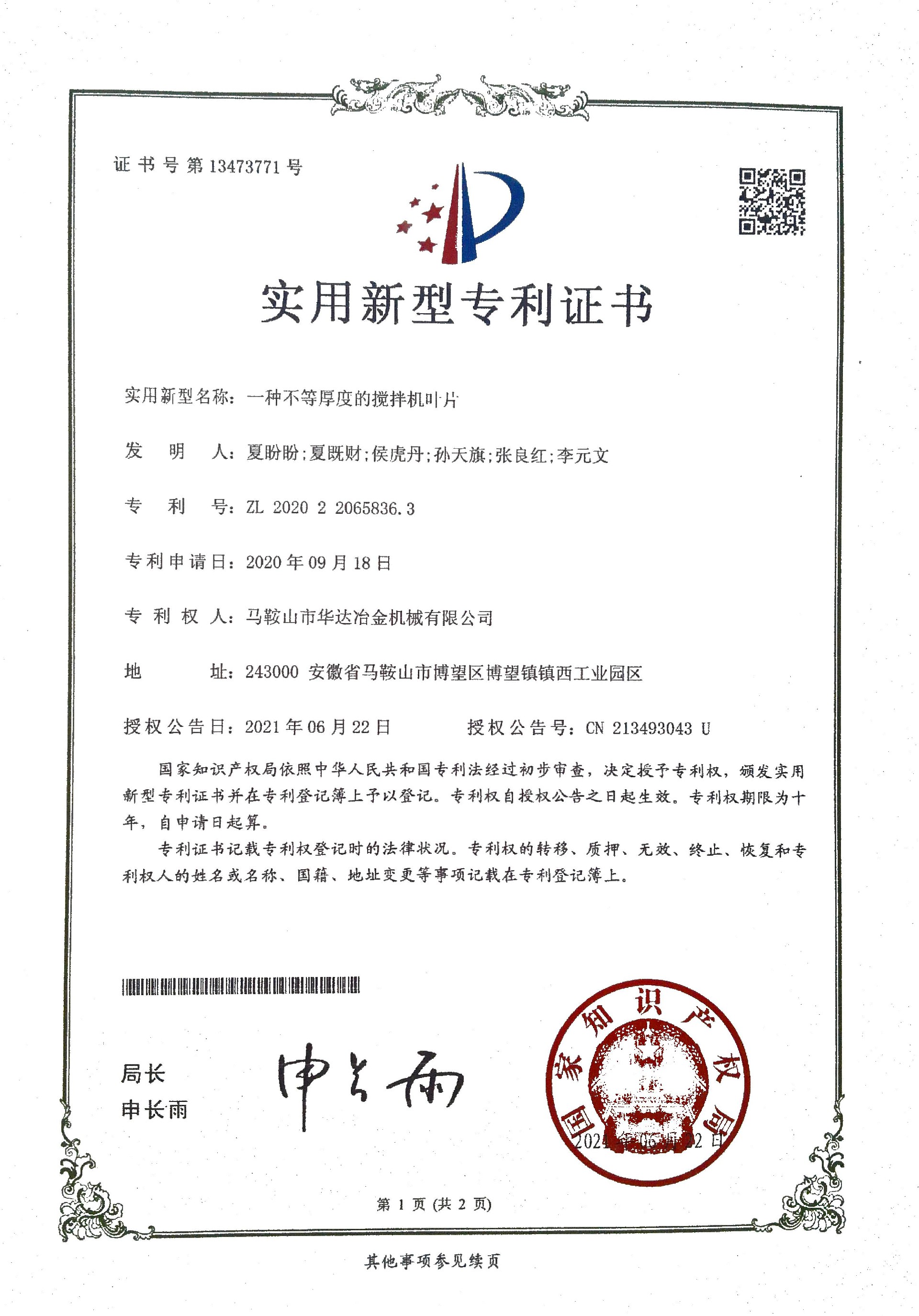 一種立軸行星式混凝土攪拌機鏟刀專利證書