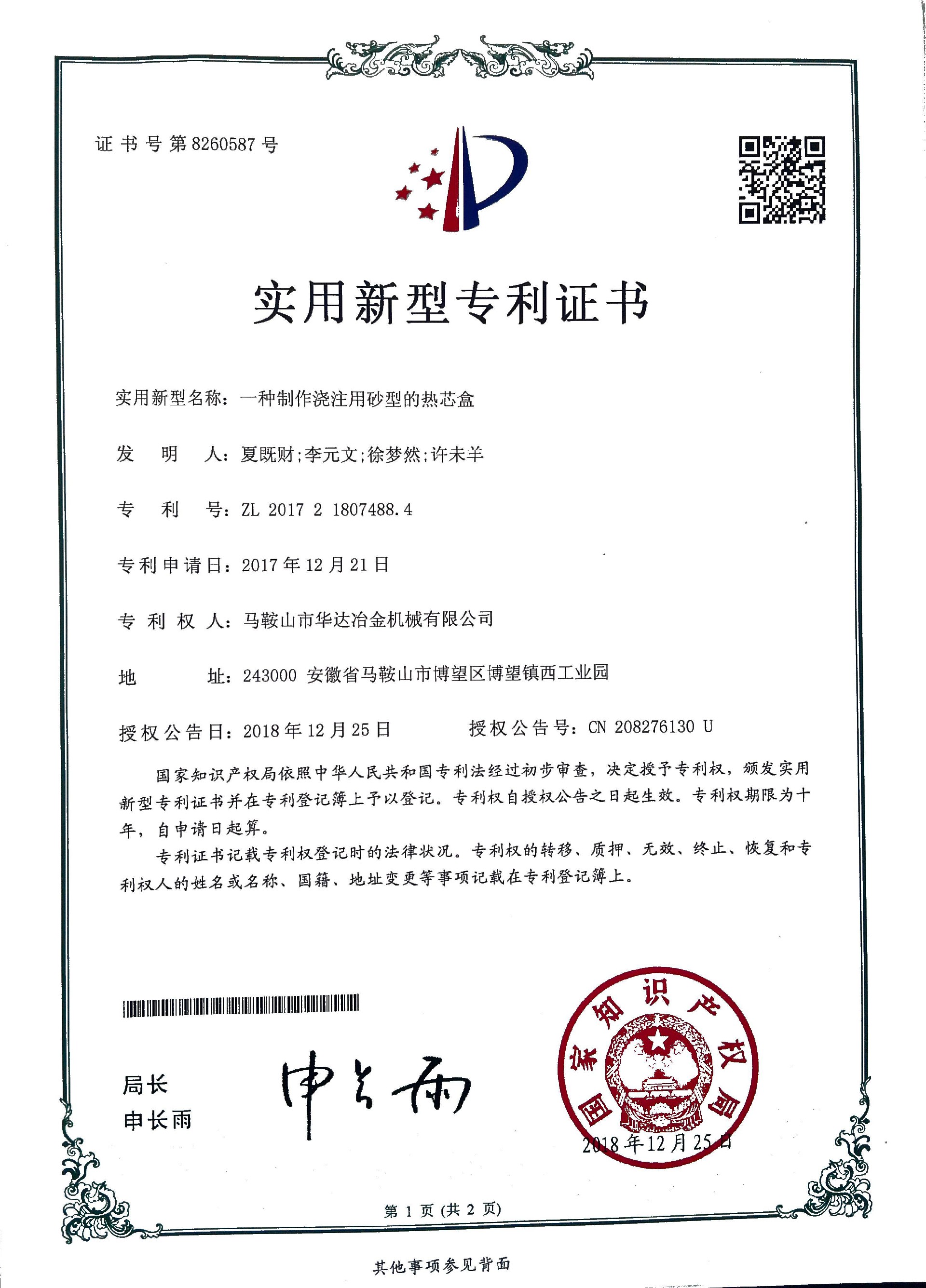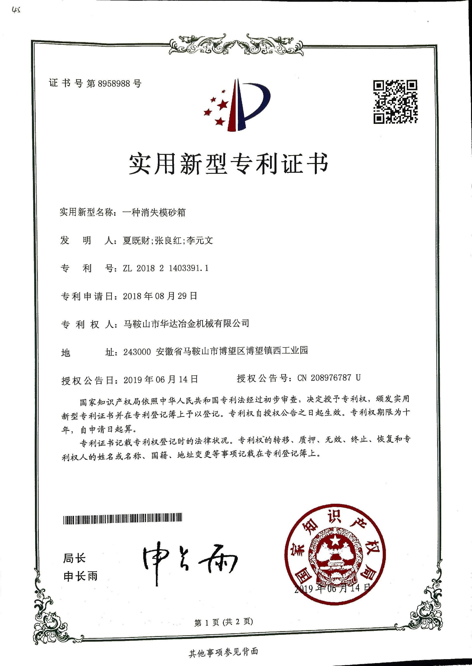 一種消失模砂箱專利證書