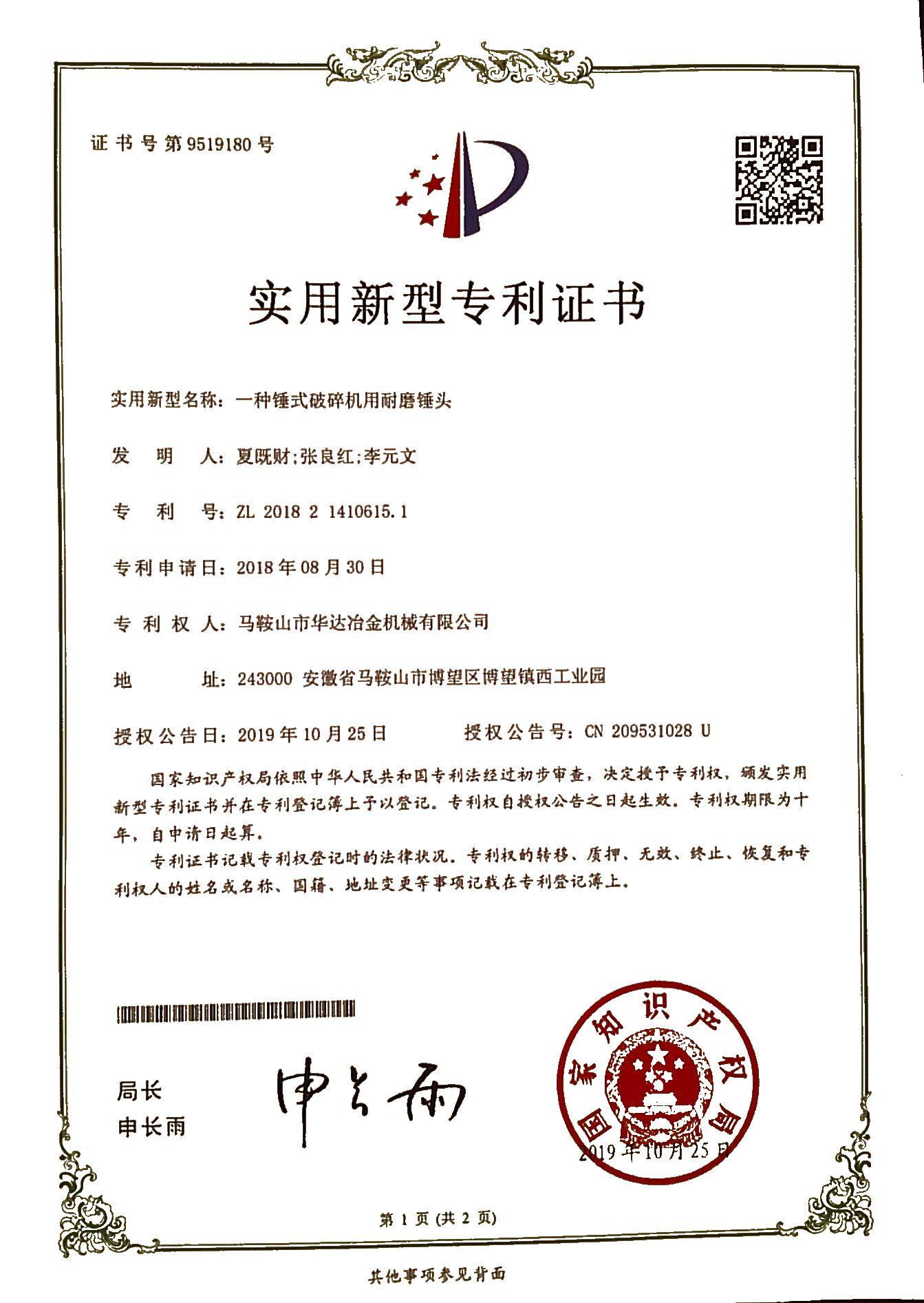 一種錘式破碎機(jī)用耐磨錘頭專利證書