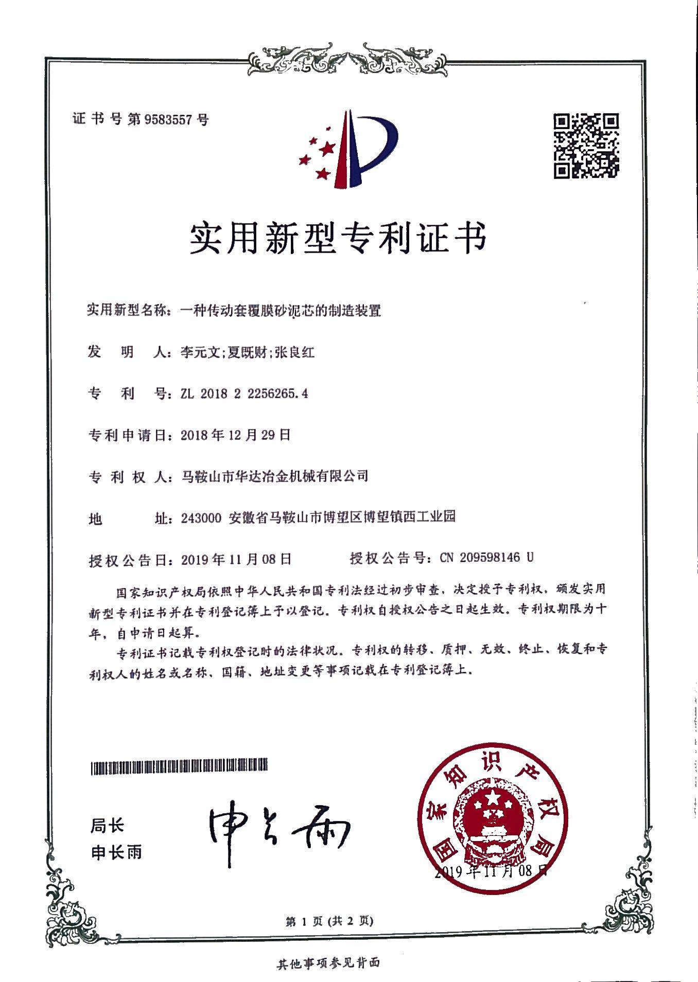 一種傳動(dòng)套覆膜砂泥芯的制造裝置專利證書
