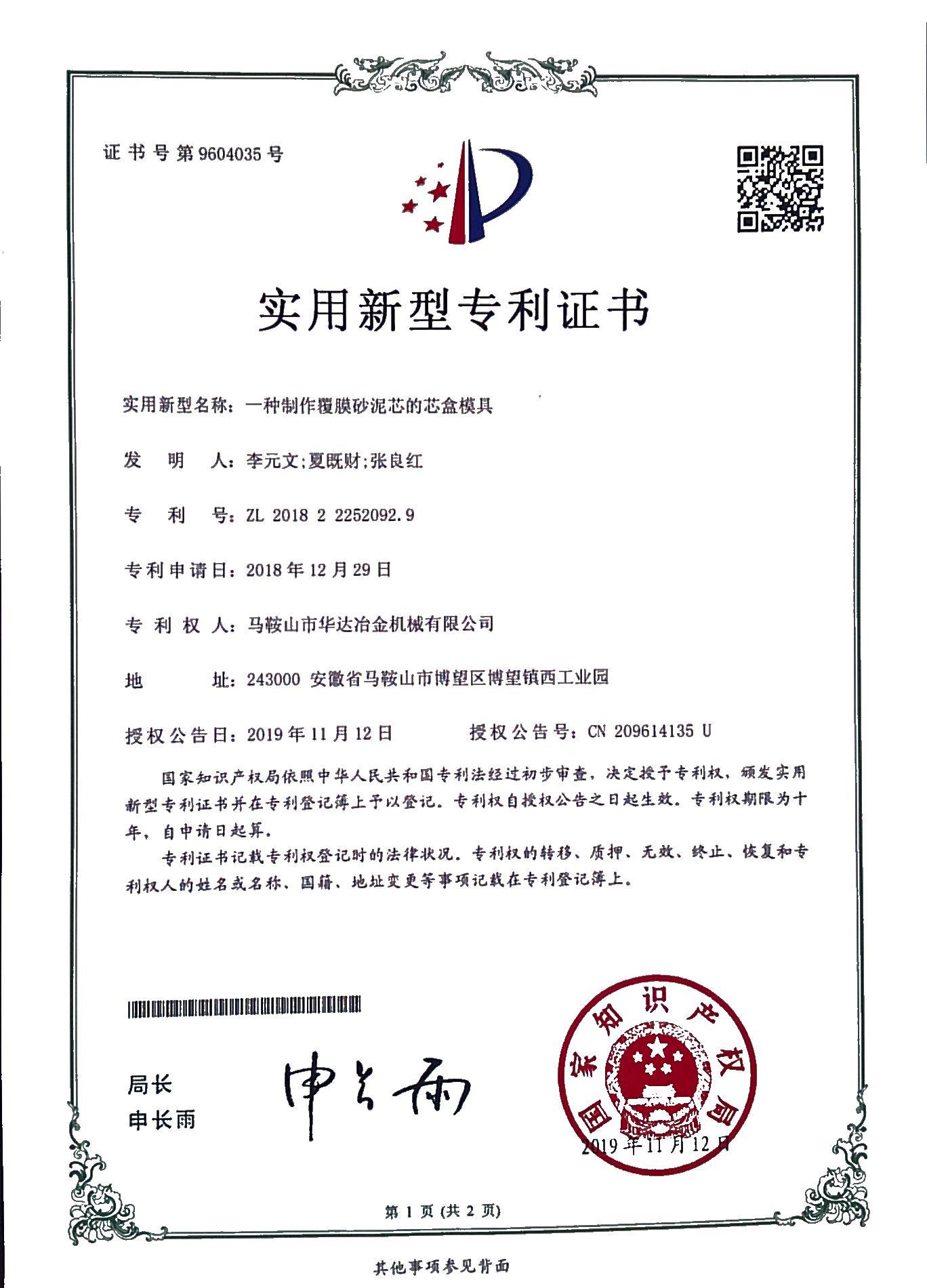 一種制作覆膜砂泥芯的芯盒模具專利證書