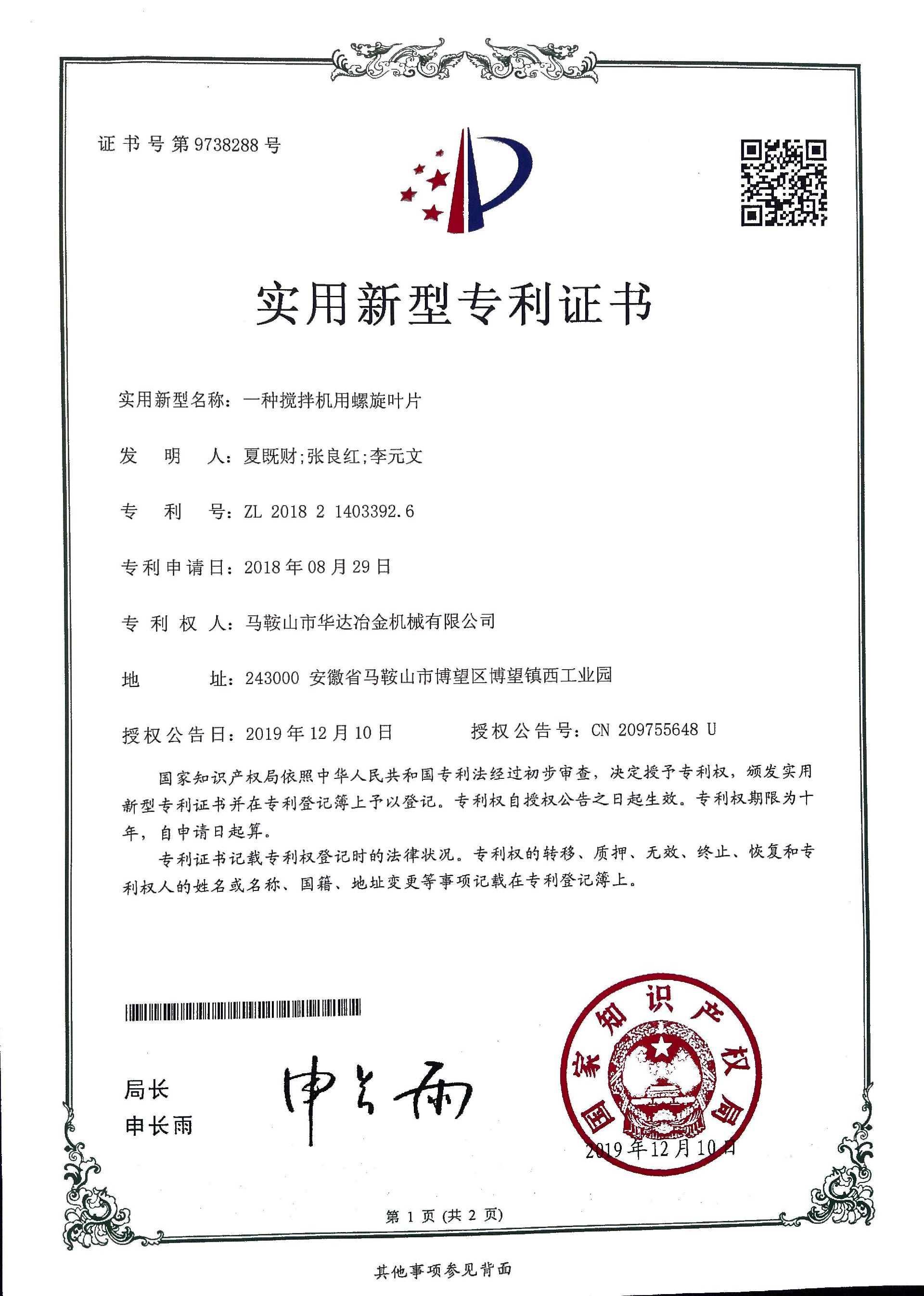 一種攪拌機(jī)用螺旋葉片專利證書