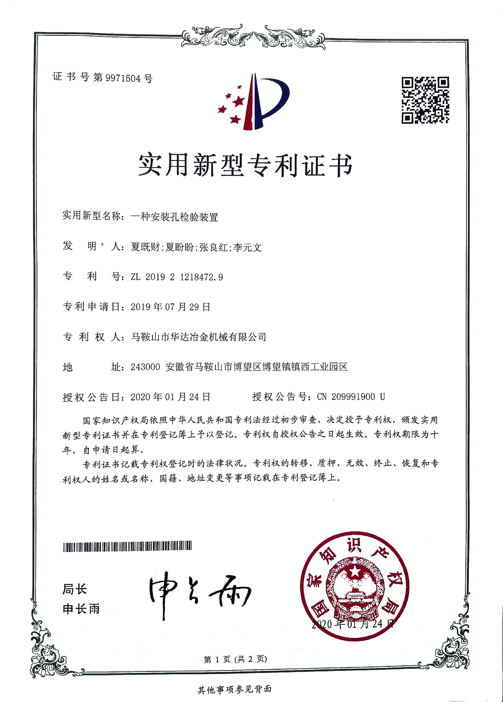 一種安裝孔檢驗(yàn)裝置專利證書