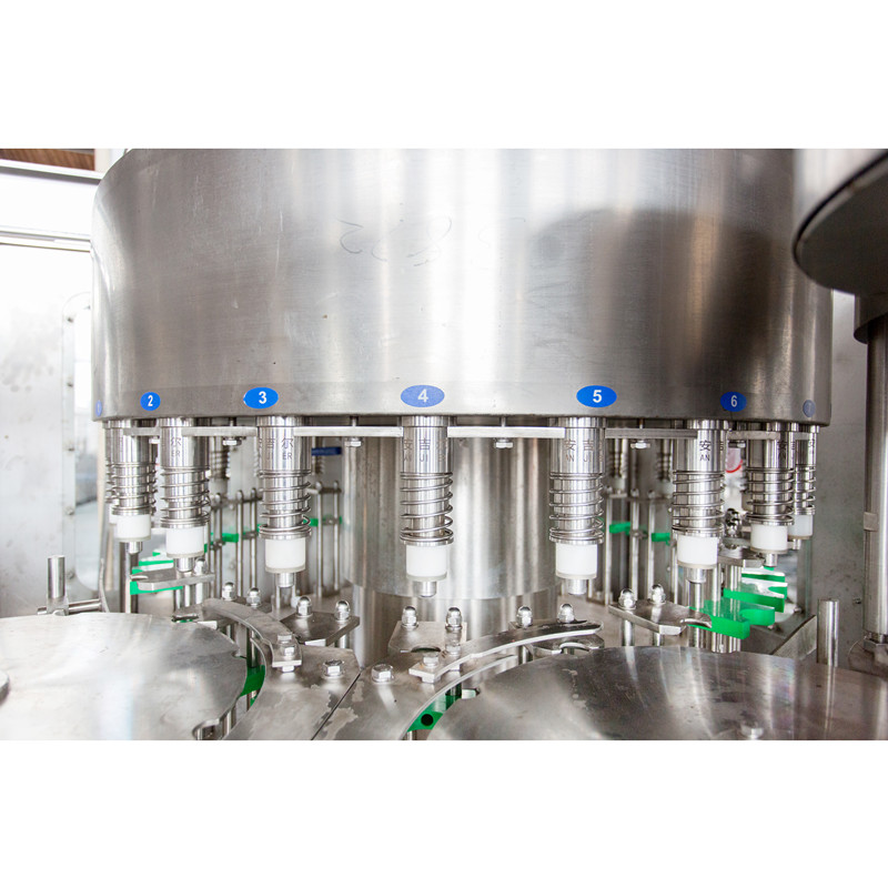 XGF24-24-8三合一灌裝機主要用于礦泉水、純凈水的灌裝作業。本機將沖洗、灌裝、旋蓋三功能合在一個機體上,全過程實現自動化。適用于聚酯瓶、塑料瓶,各部分的適用瓶型調整采用手柄轉動實現,輕松自如,簡便快捷。灌裝方式采用了新型的常壓灌裝,使灌裝速度更快更穩定,所以與同規格的機器相比本機的產 量更高,效益更大。本機采用了先進的可編程控制器(PLC)控制機器的自動運行,進瓶鏈道采用變頻器調整,與主機變頻器相互配合使進瓶運行更穩定可靠,光電檢測各部件的運行狀況。自動化程度高,操作簡便。是礦泉水、純凈水生產廠家理想的首先設備。